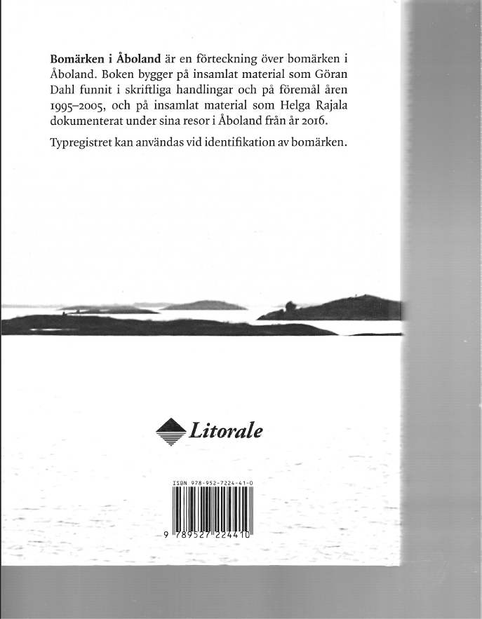 Bomärken i Åboland har en illustrerad förteckning över tusentals ritade bomärken i svenska Åboland. Boken bygger på insamlat material som Göran Dahl åren 1995-2005 hittat i gamla skriftliga handlingar och på gamla föremål, och på insamlat material som Helga Rajala dokumenterat under sina resor i Åboland från år 2016.
