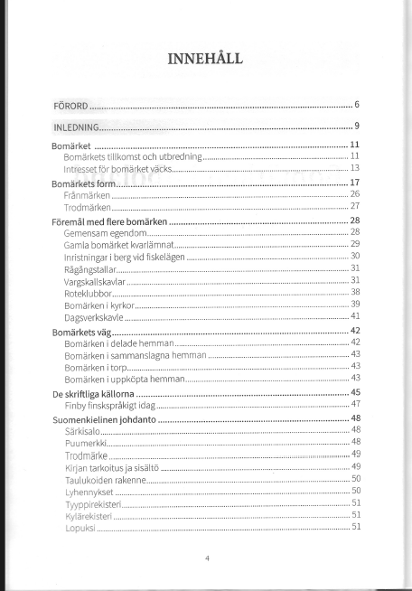 Efter en allmän inledning om bomärken presenteras tio socknar, dess byar och gårdar i egna kapitel. Kapitlen inleds av en sammanställning över socknens bomärken och en karta med socknens bynamn. Därefter följer en förteckning över alla bomärken och namn på deras användare och angivelse av källa samt årtal. Boken innehåller även ett typregister, som kan användas vid identifikation av bomärken.